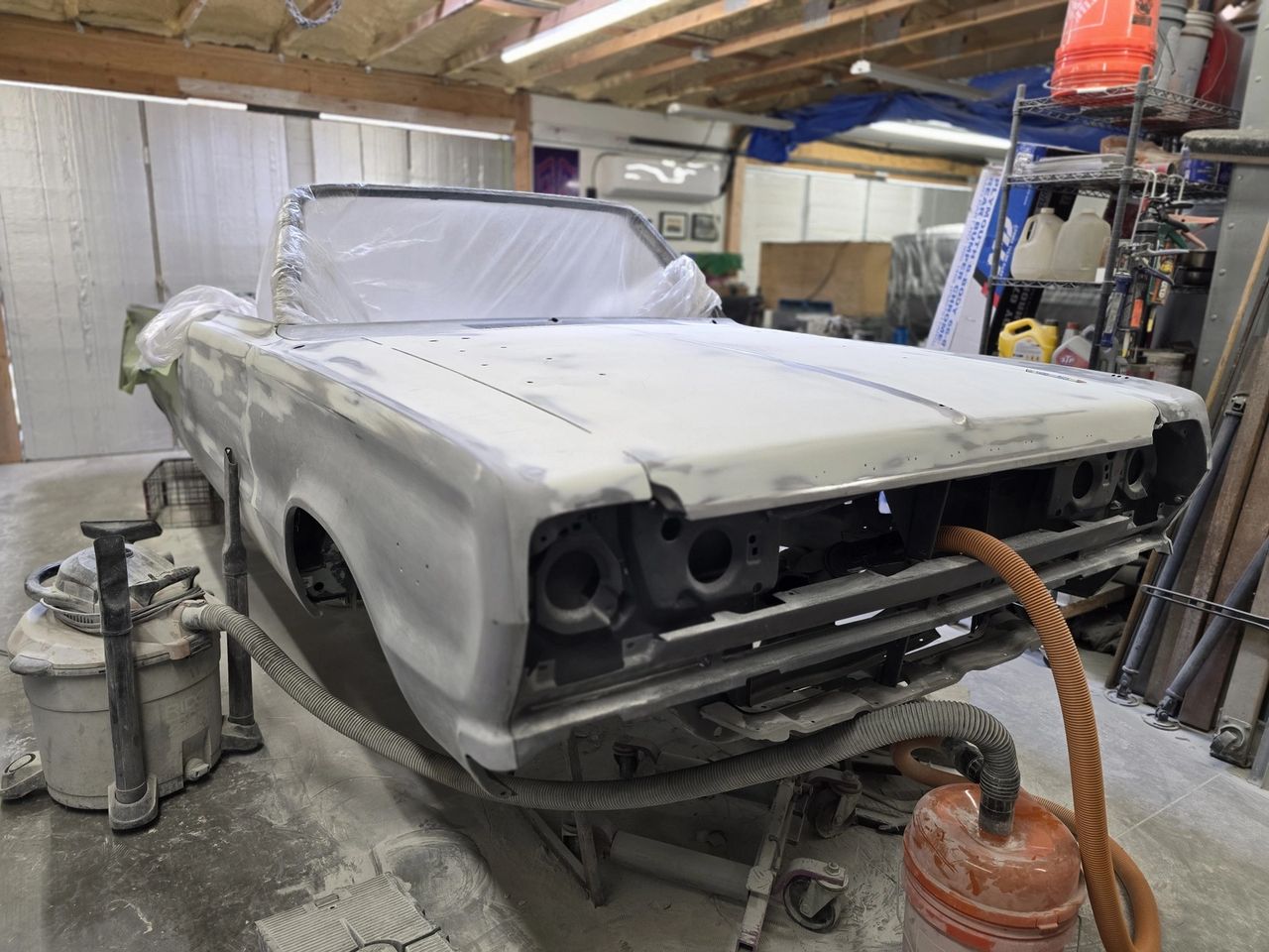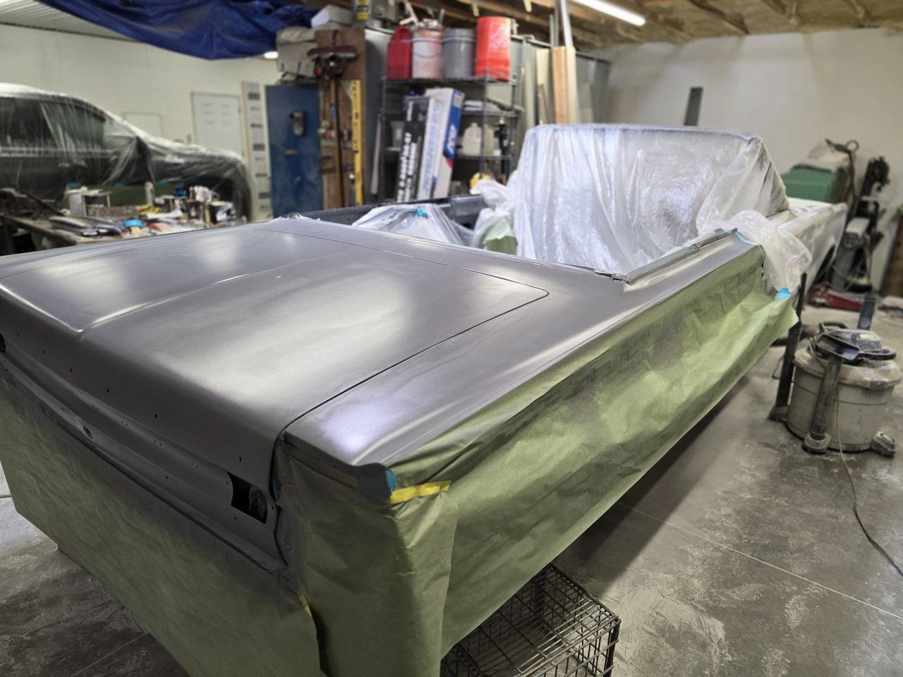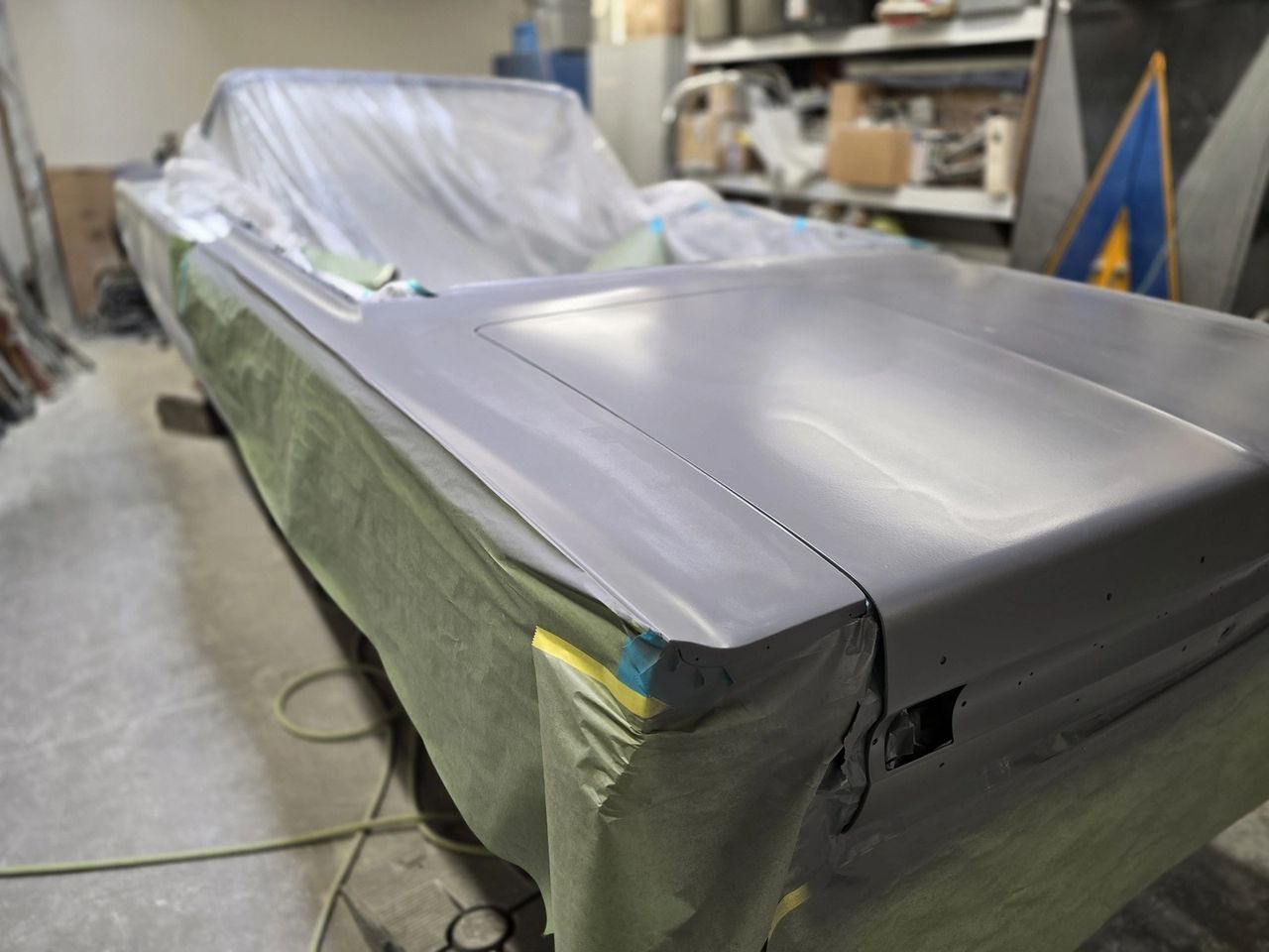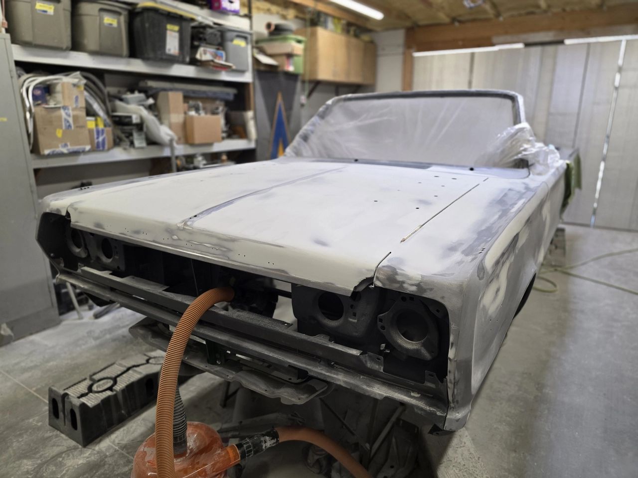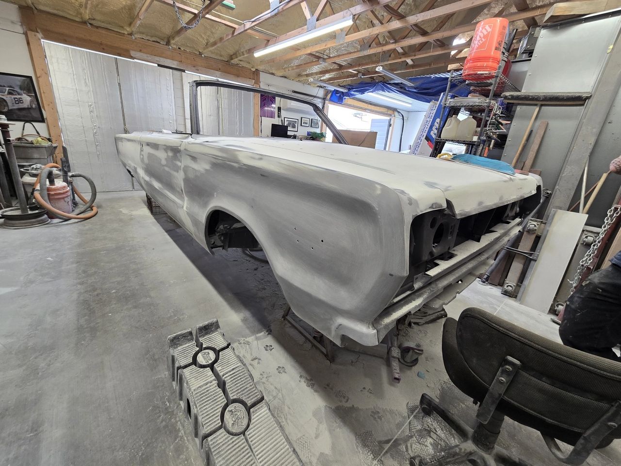 Some photos show where we are as of toady in the final stages of prep for the paint. The paint process itself will be done in stages….underside, body, all the panels (doors, fenders, hood trunk lid) and then the interior and trunk and engine compartment. Looking forward to showing some color on this car finally which should look amazing especially when we finally see it out in the daylight.