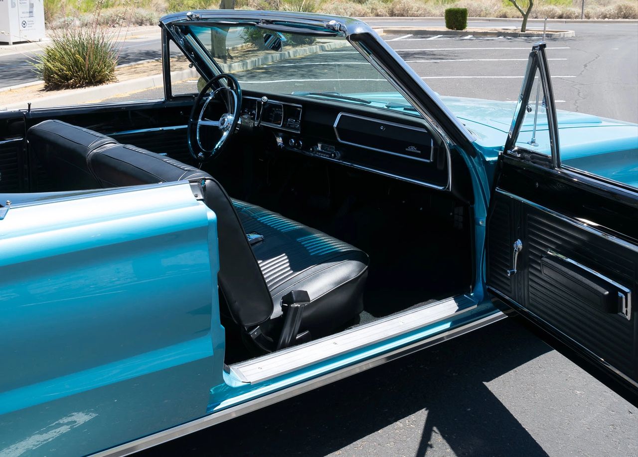 Blue vintage convertible car parked outside.