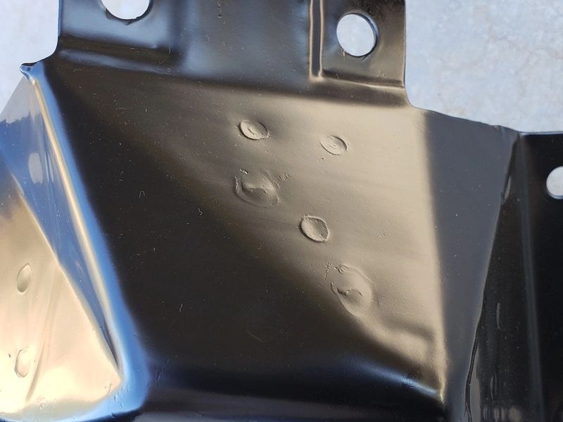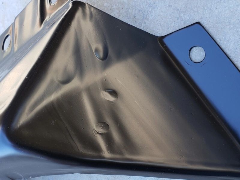 The original coil spring covers were dipped in black paint and not sprayed with paint.  So in order to duplicate the same exact finish (with runs) these pieces were refinished with the same process.  Notice the original hardware that was reused.  The mounting hardware consisted of bolts with nylon inserts to help hold them in place.  Not all Boss 429s had the exact same hardware.