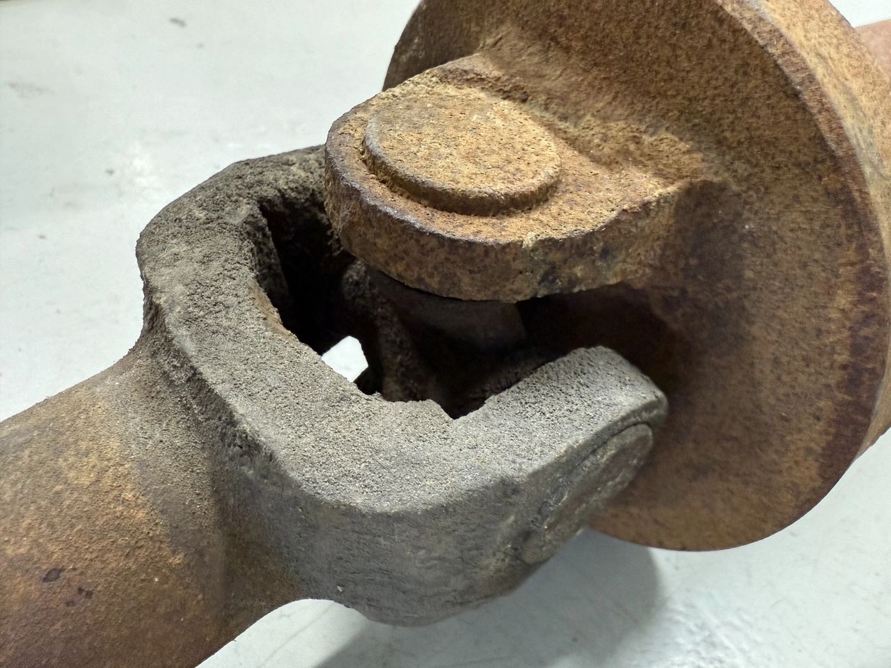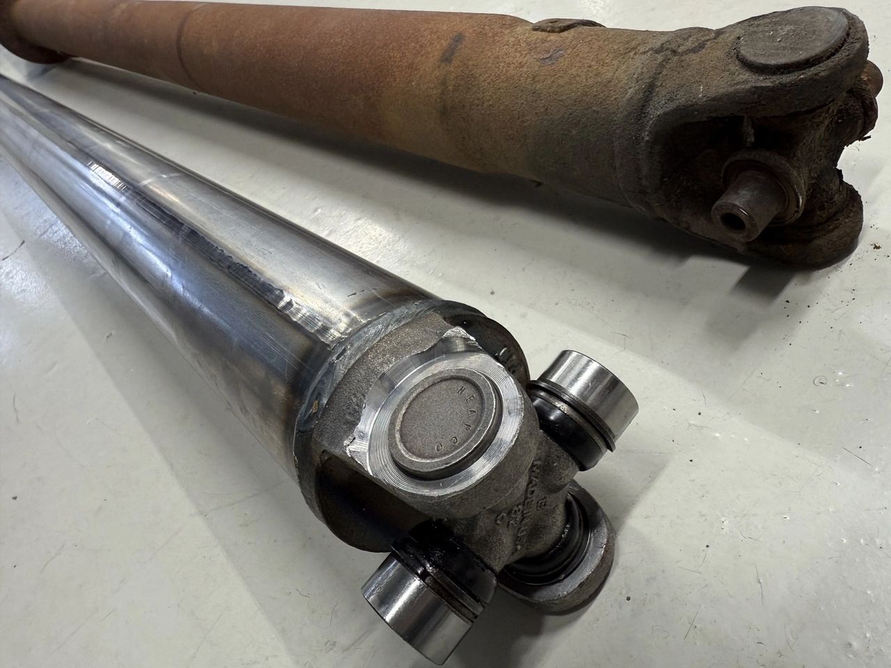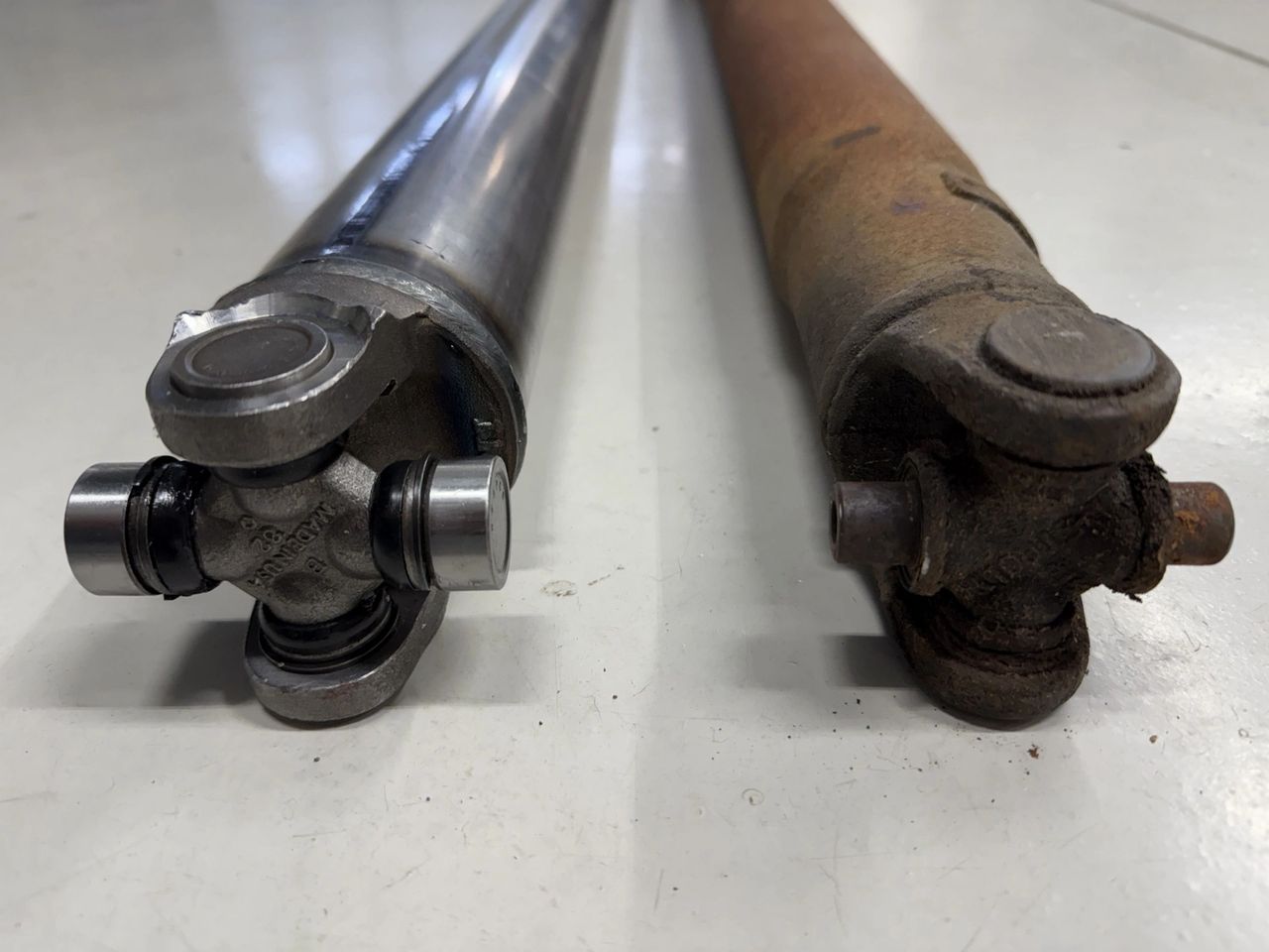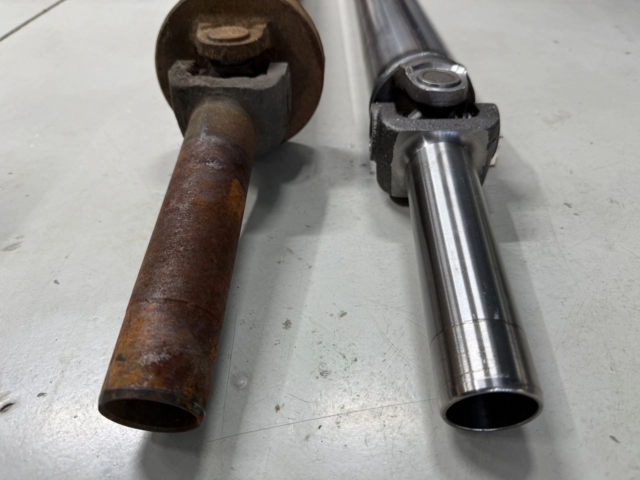 Two car driveshafts, one rusty, one shiny.