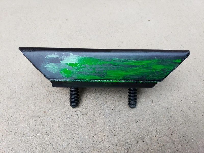 Some before and after photos of the original engine mounts and transmission mount. The transmission mount on a 1970 Boss 429 will typically have green paint on it that was used to identify it. Also note that the left and right side engine insulator to body bracket bolts are different. The left side typically has a separate washer that is not on the right side which had a flanged head on the bolt.