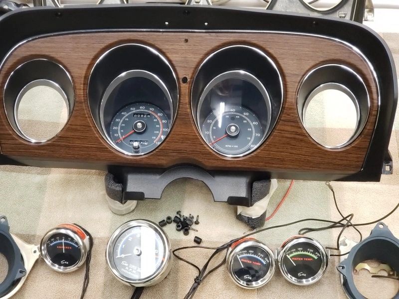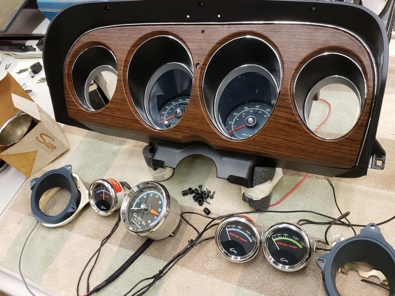 Working on all the gauges and instruments on the Lawman. Originals were replaced back in 1970 with Sun gauges because they were one of the sponsors of the car and team. Getting the correct vintage gauges was difficult but located all of them including the original style Super Tach that was available in 1970. The instrument bezel was rechromed and painted black with argent on the insets and new plastic lense for the instruments. Extra holes in the center are for the mounting of the tach and also for the wiring.