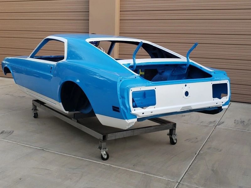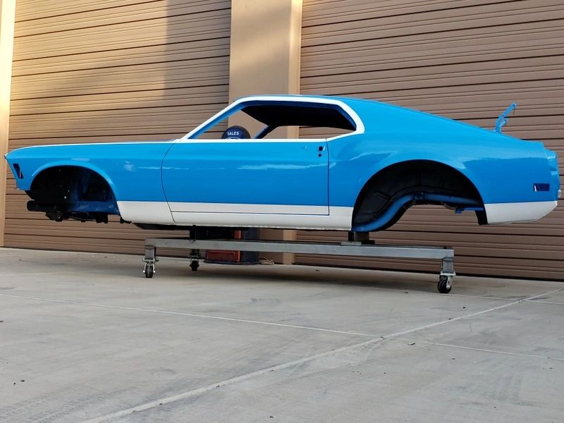 Blue classic car body on stand.