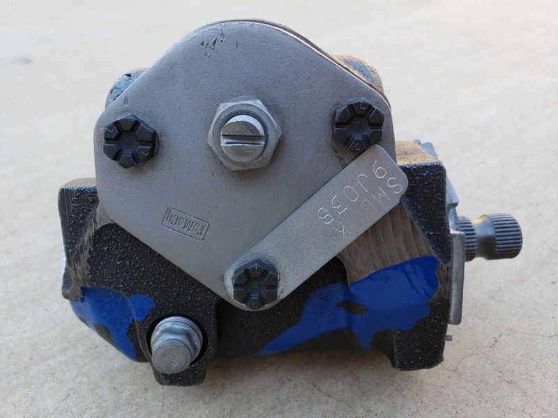 Metal steering gearbox on concrete surface.